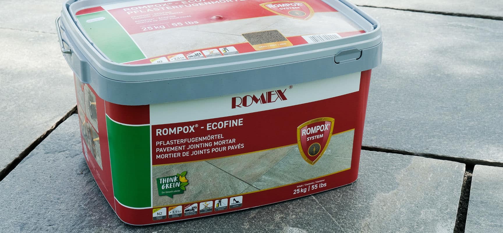 ROMPOX® – ECOFINE, en sterk, bærekraftig 1-komponent fugemørtel med 2-komponent-egenskaper. Ecofine er en bruksklar fugemørtel som herder ved kontakt med luft eller oksygen. Mørtelen kan brukes til å fuge nesten alle plater og steiner rundt huset med en fugebredde på 3 mm eller mer.