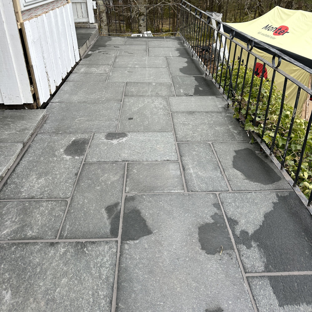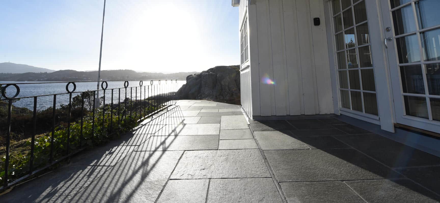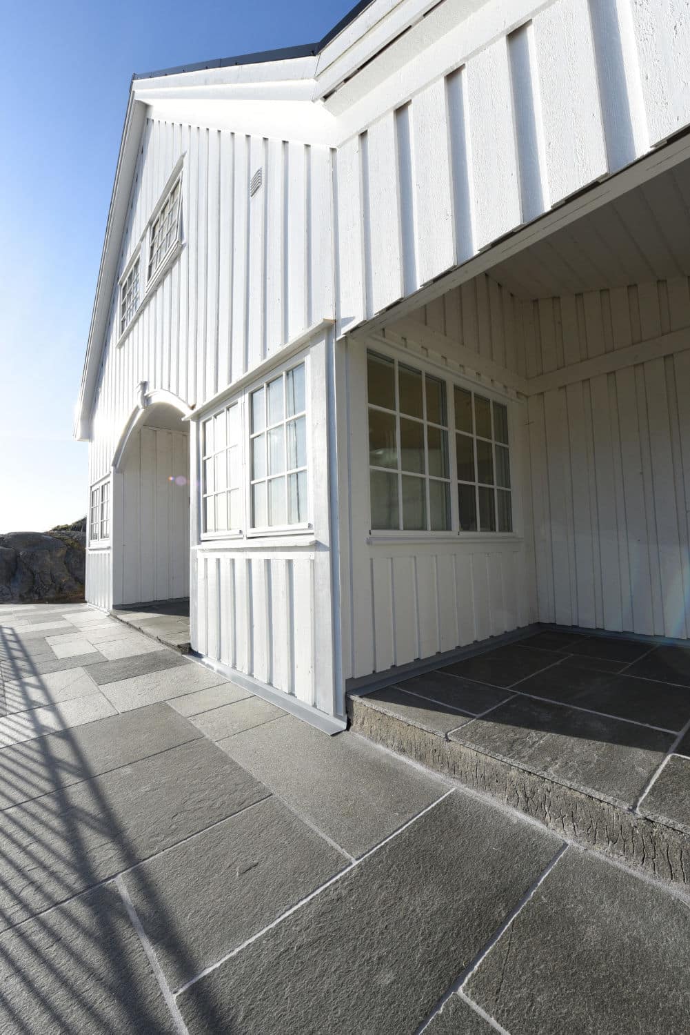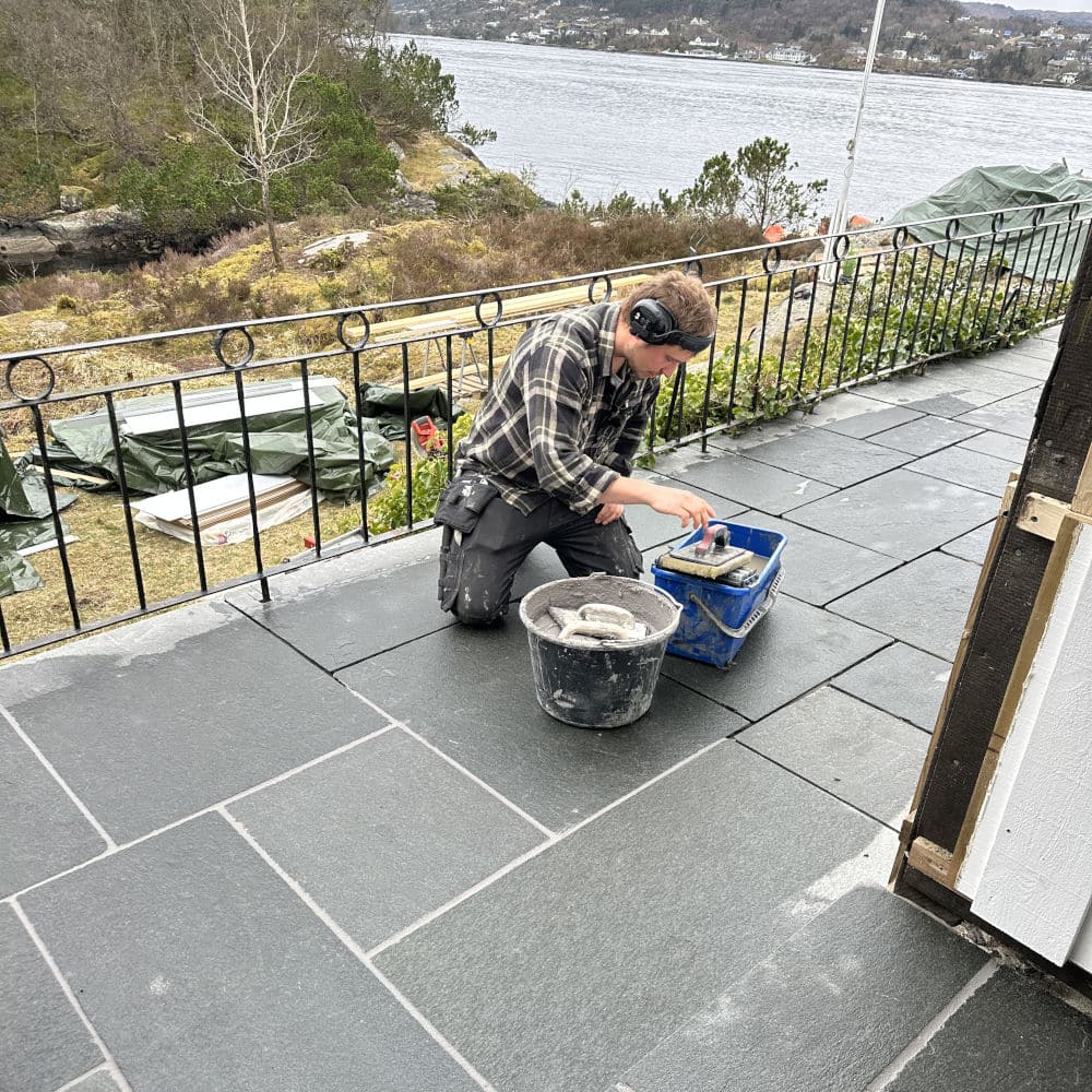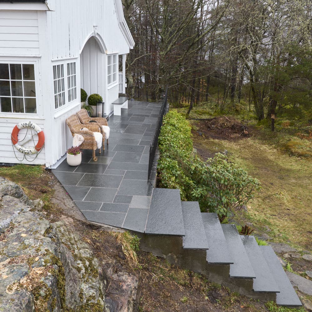 Uteområdet ble løftet med Stoneart Bruddskifer Roman, en eksklusiv løsning som kombinerer rette linjer med et levende, tidløst uttrykk. Inspirasjonen til skiferen er hentet fra Fløyen, der klassisk norsk skifer danner rammen rundt Bergens kanskje vakreste utsikt. Resultatet på Odden ble et varig og elegant uteareal som tåler vestlandsvær – og som fremhever både naturen og historien rundt hytta.