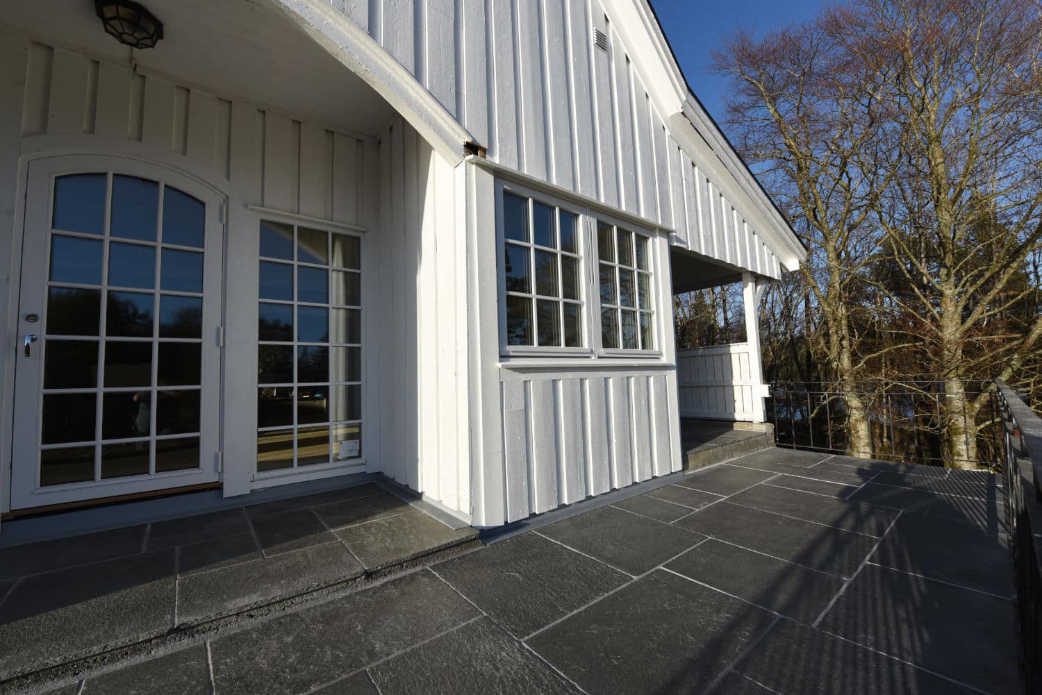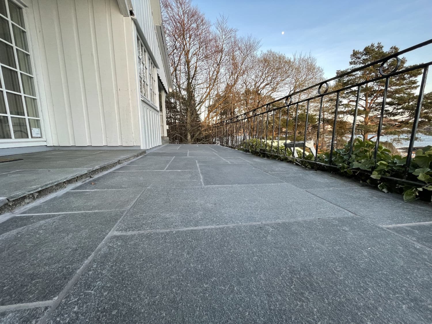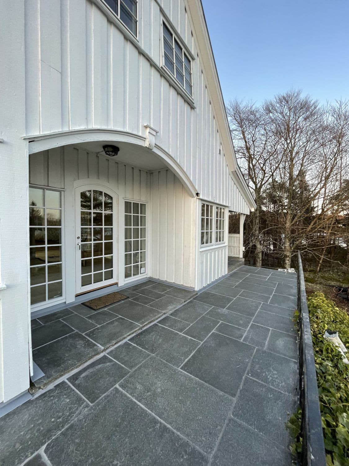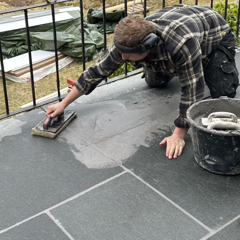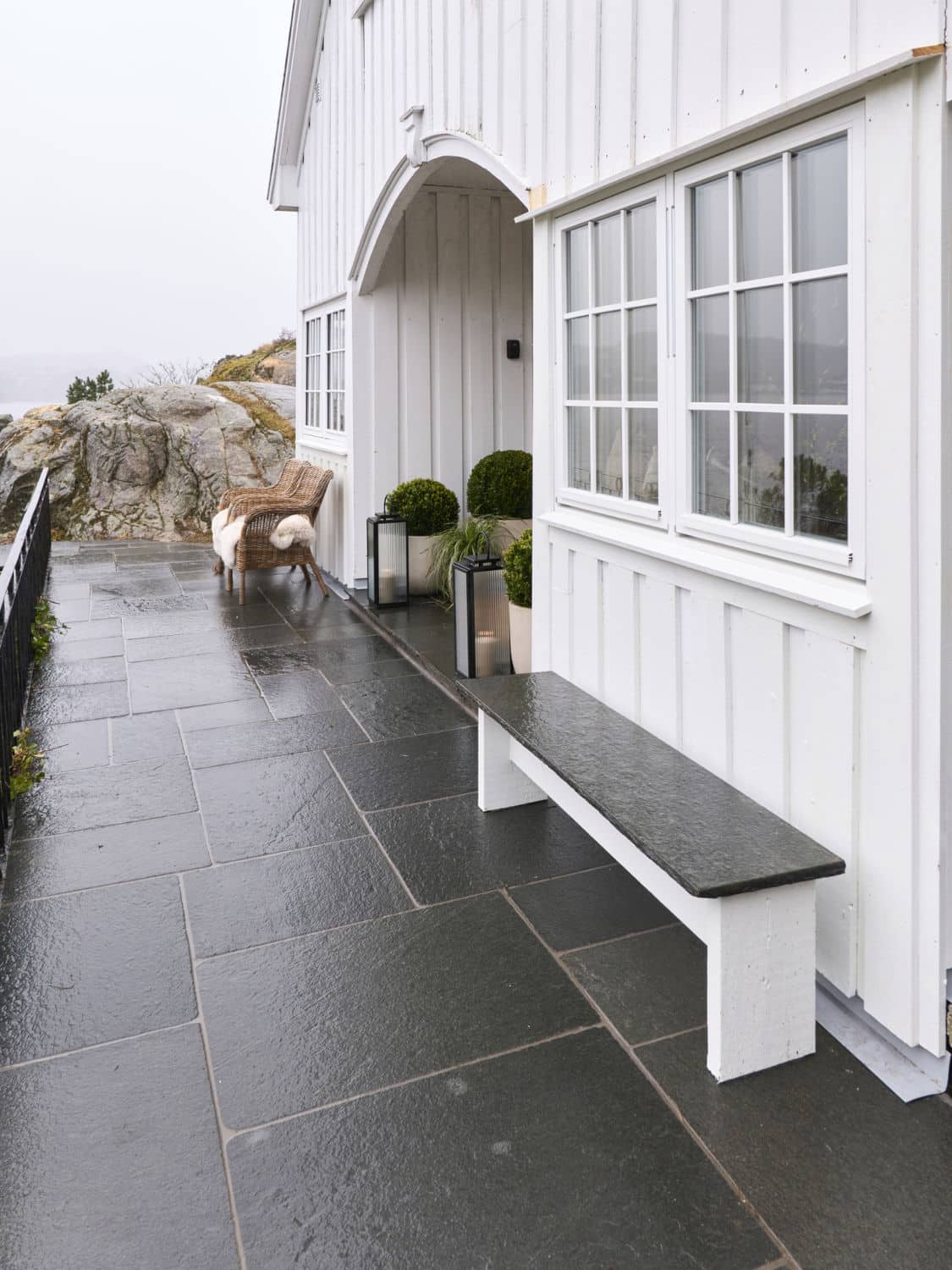 Uteområdet ble løftet med Stoneart Bruddskifer Roman, en eksklusiv løsning som kombinerer rette linjer med et levende, tidløst uttrykk. Inspirasjonen til skiferen er hentet fra Fløyen, der klassisk norsk skifer danner rammen rundt Bergens kanskje vakreste utsikt. Resultatet på Odden ble et varig og elegant uteareal som tåler vestlandsvær – og som fremhever både naturen og historien rundt hytta.