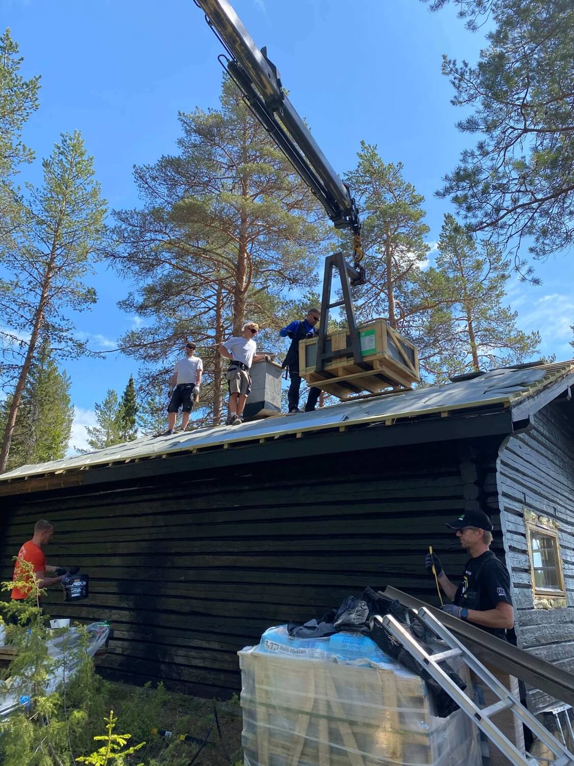 På taket ligger Altaskifer 47×47 cm. Samme skifer type og størrelse som hytta i Eventyrlig Oppussing.