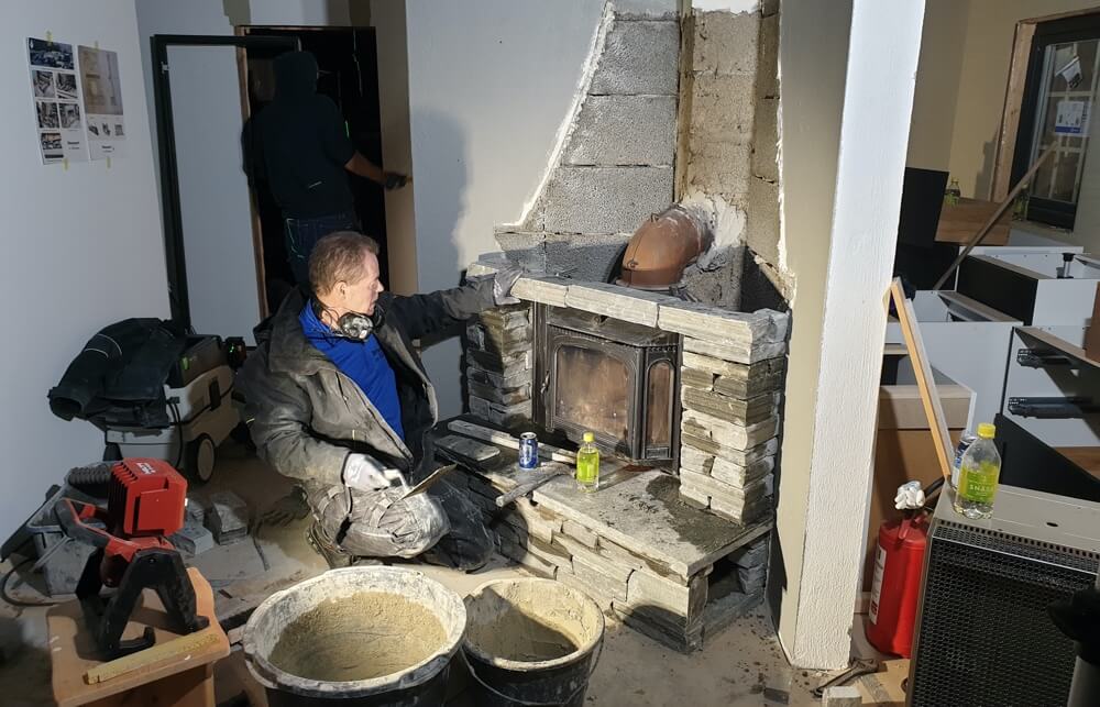 Midt i rommet står peisen som med blir «ny» med tørrmur fra Dovreskifer. Skiferen var ferdig tilpasset og monteringen gikk på en drøy arbeidsdag. Ole tilpasset trestokken og satte den på plass så Halvor kunne fyre opp.