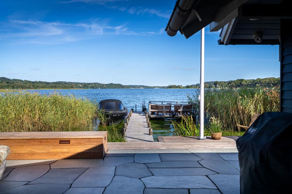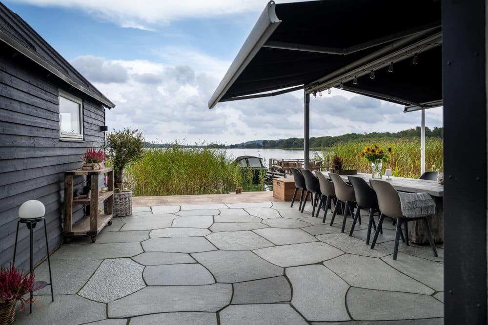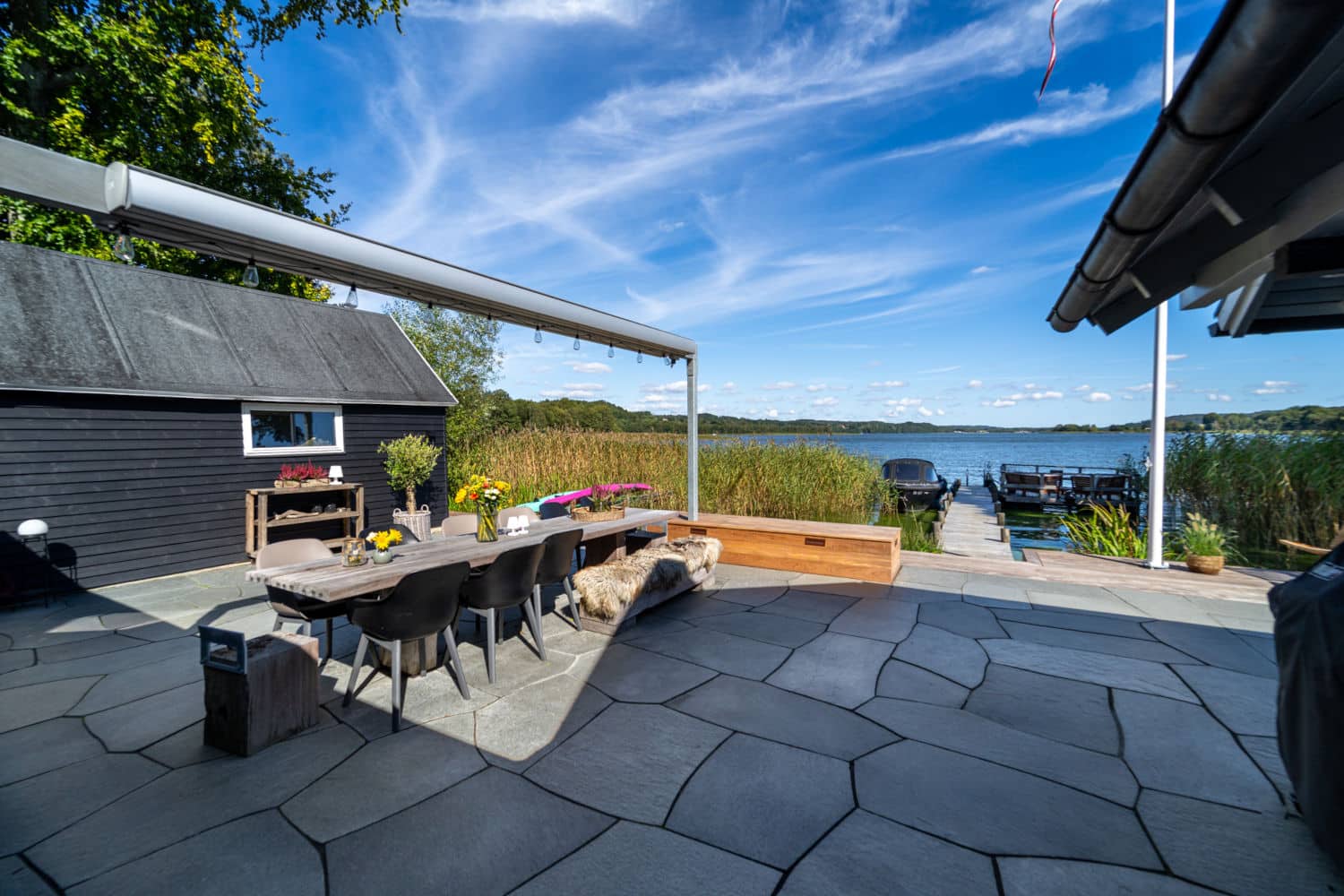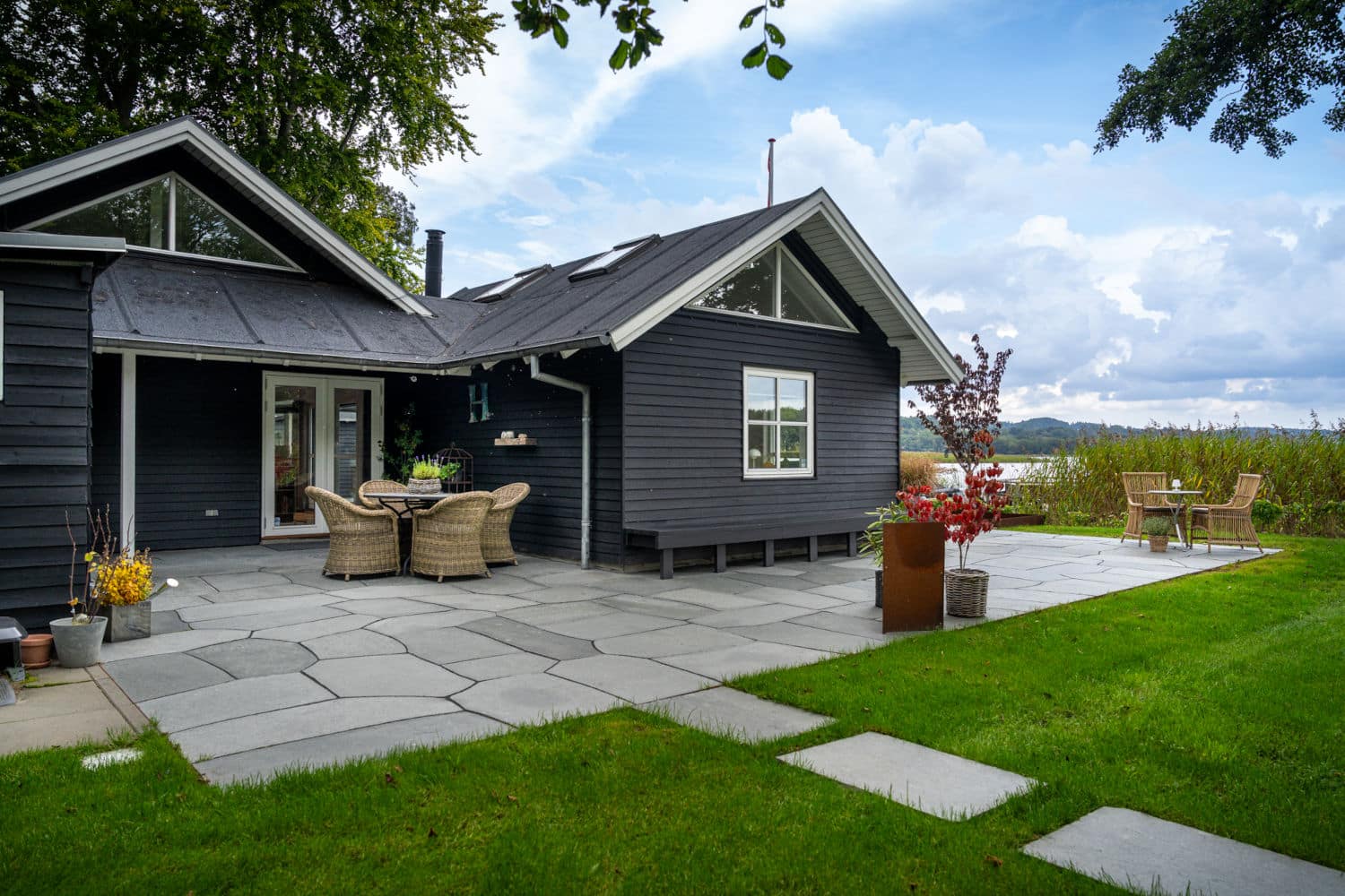 Utenfor Århus på Jylland ved kysten av Knudsøssjøen, omgitt av siv og en egen brygge, er en tidligere hytte blitt forvandlet til et moderne hjem. Stoneart Bruddskifer Klassisk ble valgt for å gi uteområdene en solid og tidløs karakter som harmonerer perfekt arkitektur og natur. Bruddskiferen kom ferdig tilpasset, med bilder, nummerert og merket. Montering av 150 m² gikk på halvannen dag med lokale krefter.