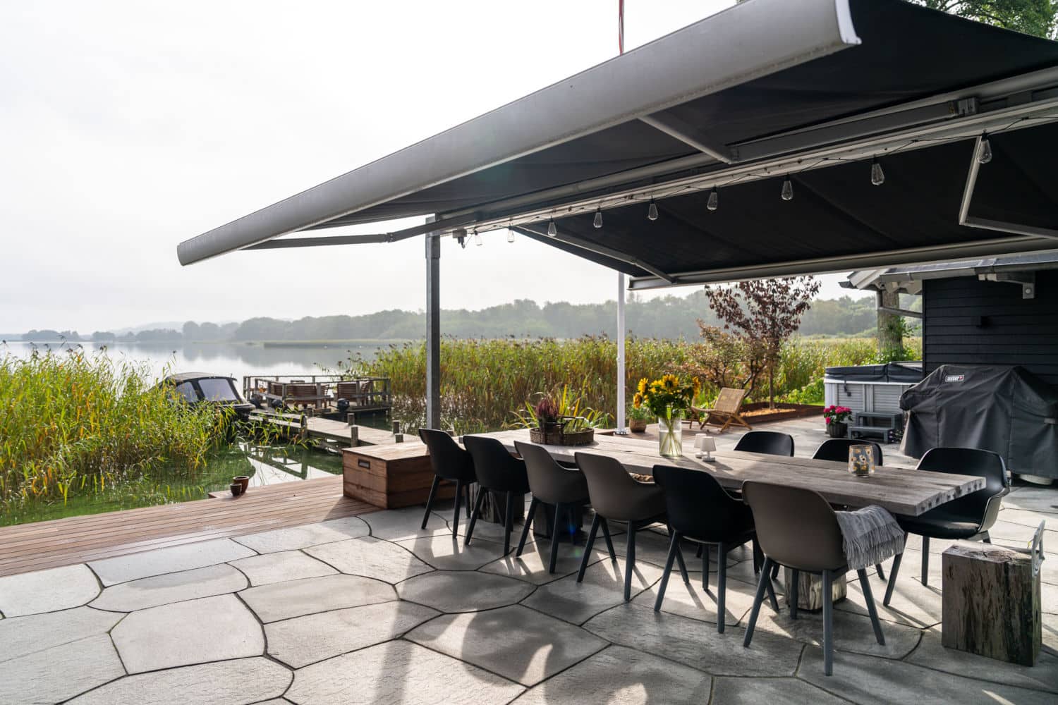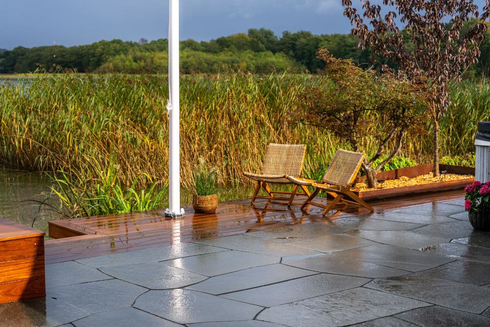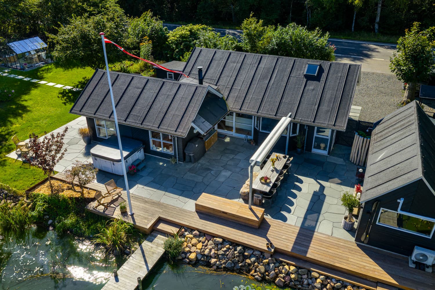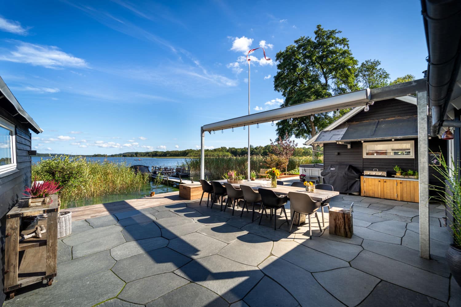 Utenfor Århus på Jylland ved kysten av Knudsøssjøen, omgitt av siv og en egen brygge, er en tidligere hytte blitt forvandlet til et moderne hjem. Stoneart Bruddskifer Klassisk ble valgt for å gi uteområdene en solid og tidløs karakter som harmonerer perfekt arkitektur og natur. Bruddskiferen kom ferdig tilpasset, med bilder, nummerert og merket. Montering av 150 m² gikk på halvannen dag med lokale krefter.