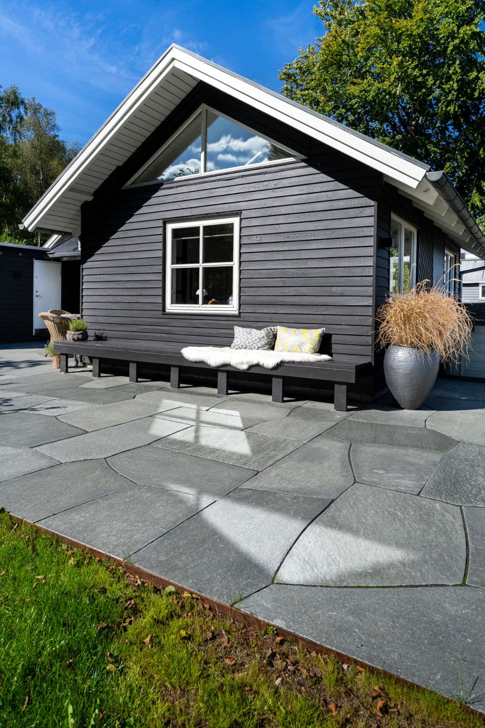 Skifer kan brukes ute og inne. På støpte flater og i løsmasser. I dette prosjektet er det montert Mørk Oppdal storbrudd.